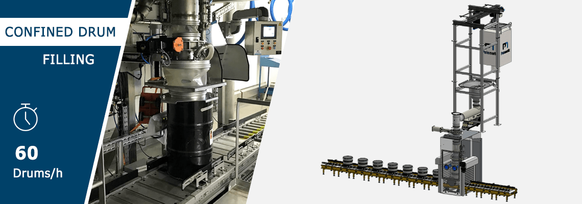 The contained drum reconditioning unit integrates a big bag unhooking solution equipped with a glove box. The big bag is placed on the unloading station by an electric hoist, which is controlled by the packaging operator.
